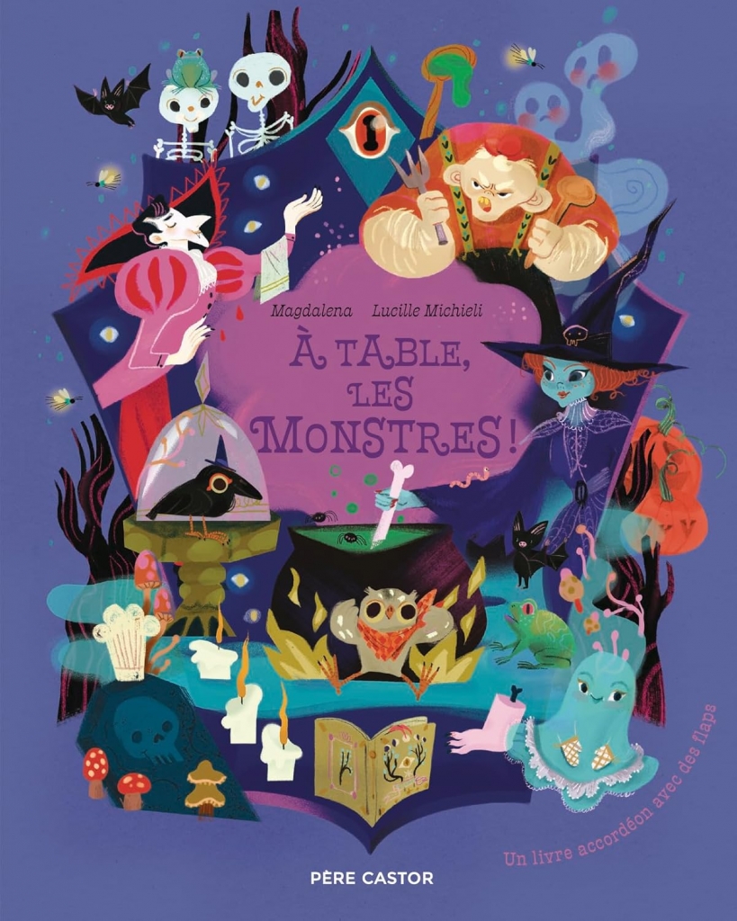 Pour la fête des monstres, chacun va préparer son plat préféré. Alors que la sorcière triche et envoie ses corbeaux espionner ses concurrents, chez les squelettes on prépare une omelette de crevettes à la sauce ciboulette ; le loup-garou lui mijote un ragoût de hiboux aux choux ; la Pirates à tresses cuisine une bouillabaisse au lait de tigresse ; les trois tenant de gérer escargots et asticots alors que les fantôme mettent au four un friand de carats aux épinards… pour le vampire vous ne voulez même pas savoir ce qu’il prépare et lorsque les corbeaux rendent leur rapport : pas de dessert en vu alors la sorcière va préparer son dessert préféré, un gâteau à la bave de crapaud. Mais le pire reste à venir : l’ogre est fou de rage, il n’a même pas été invité pour son anniversaire, enfin le croit-il ! Quand à vous il vous reste à déployer le leporello qui va ouvrir sur un banquet horrifique empli de monstres et de leurs plats répugnants. C’est absolument génial, on frémit juste ce qu’il faut pour les petits auxquels le livre est destiné, on adore les illustrations absolument parfaites, soignées, emplies de détails de clins d’oeil à d’autres histoires, les rabats à dévoiler pour découvrir les détails cachés de la préparation du banquet et bien évidemment le leporello de près de deux mètres de long qui va enthousiasmer petits et grands. Un album formidable pour fêter les fêtes de l’automne avec une couverture cartonnés et un superbe ruban qui se dénoue pour accéder aux surprises et merveilles cachées à l’intérieur. Totalement craquant, totalement réussi ! On adore !