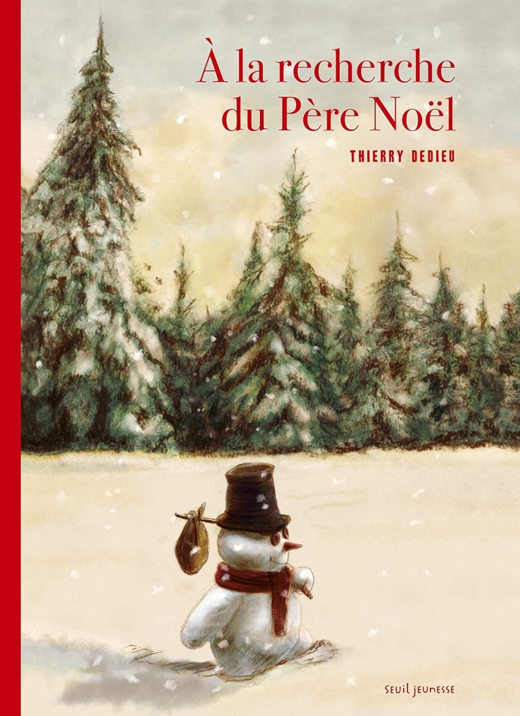 Pour Noël, Thierry Dedieu nous offre un album absolument splendide sur un petit Bonhomme de neige à la recherche du Père Noël. Un beau matin, il prit la route pour porter un cadeau au Père Noël, mais elle était longue et semée d’embûches. Et surtout il fit des rencontres un corbeau, un grand cerf, un renard qui pour lui indiquer la route, lui prirent tous un petit quelque chose, tous sauf l’ours. Et oui, lorsqu’il rencontra l’ours il n’avait plus rien à offrir… sauf… ce que vous lirez ou plus exactement fredonnerez à vos enfants ce soir là, tout doucement. La fin vous le verrez est magique et se passe de tout commentaire.